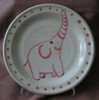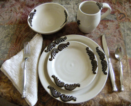 Above - Ann's place setting. Ann chose to have bees on her mugs but the swirls on the rest of the pieces. She helped me apply some of the swirls so had a part in making the set. Above right - The stack of dinner plates. Right -two large serving platters with self formed handles. |